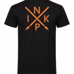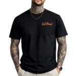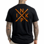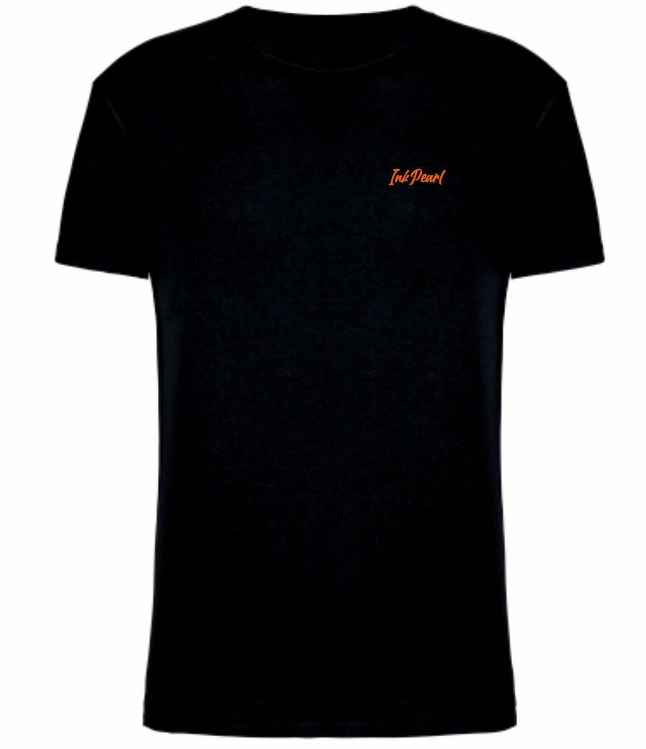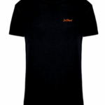 T-shirt en coton noir pour homme, taille normale avec sérigraphie orange fluo sur le devant du t-shirt côté poitrine, et dans le dos.